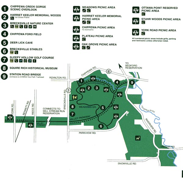 Take Route 82 east from I-77 or I-71. Go past route Route 21 (Brecksville Rd). Turn right on Chippewa Creek Dr. Go past the parking lots for Harriet Keeler Memorial Woods and Brecksville Nature Center. Chippewa Picnic Area will be on the right side of the road.