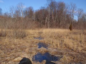 Tom, Martha, Liz and I met behind the firestation and carpooled to the Rt 303 property today, March 1, 2009 (before Buzzard Day). Here is a list of our findings First without snow on the ground and the bushes beaten down from the past snow, footing was relatively easy going today. The temperature was in the teens. The sky was clear and the birds were singing. Canada Goose